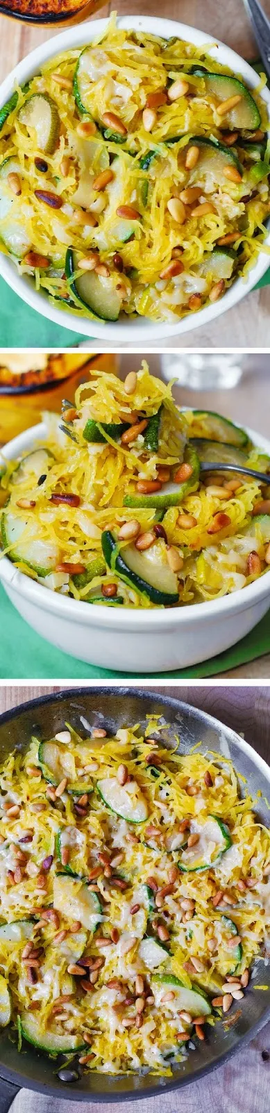 - Add spaghetti squash to the skillet with zucchini and mix to combine, on low heat.