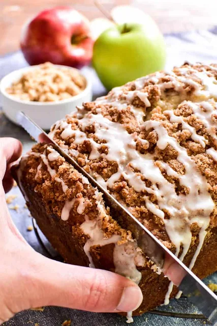 Between the fresh chopped apples and the brown sugar cinnamon streusel and the sweet cinnamon glaze, this bread really does have it all.