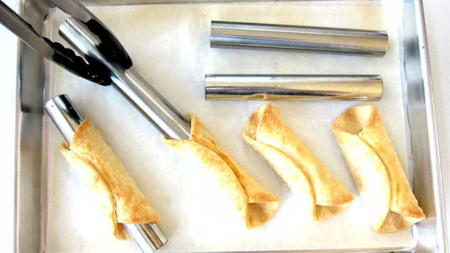 3. Remove and bake for 10-12 minutes until lightly golden brown. Allow to cool for 10 minutes then carefully remove them from the cannoli forms. Let them cool completely.